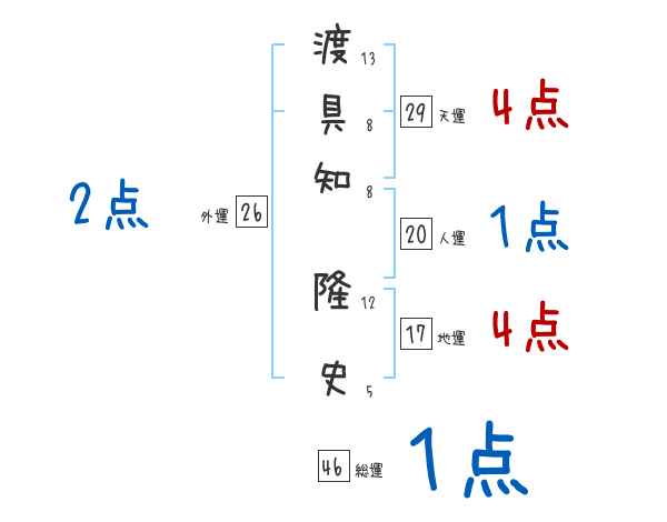 外運![]() | 渡具知隆史さんの外運は26画の2つ星!波瀾万丈かも。信頼できる人を大事にしましょう。 生活面を象徴する運勢です。外部から受ける影響力を表し、結婚運、家庭運や職場、環境への順応性を表します。 |