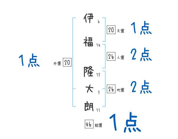 地運![]() | 伊福隆大朗さんの地運は26画の2つ星!波瀾万丈かも。信頼できる人を大事にしましょう。 個性を表す基礎的な運勢です。性格形成や対人関係、行動力など家庭環境に影響されます。主に誕生してから20歳くらいまでの若年期の運勢を表します。 |