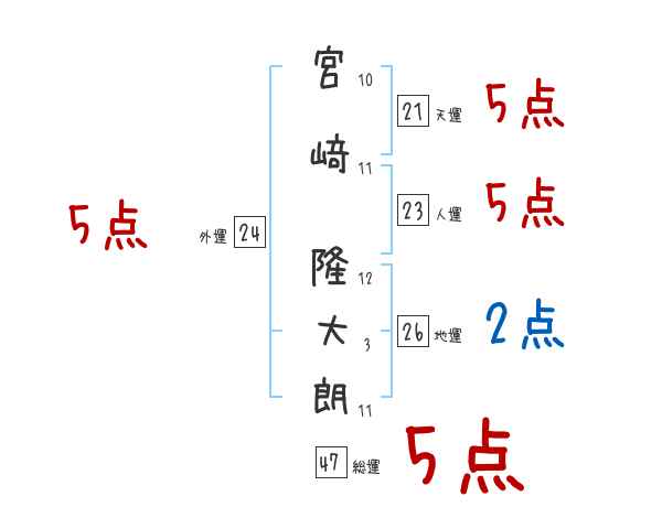 外運![]() | 宮﨑隆大朗さんの外運は24画の5つ星!家庭運が良く順調な人生。金運にも恵まれる。 生活面を象徴する運勢です。外部から受ける影響力を表し、結婚運、家庭運や職場、環境への順応性を表します。 |