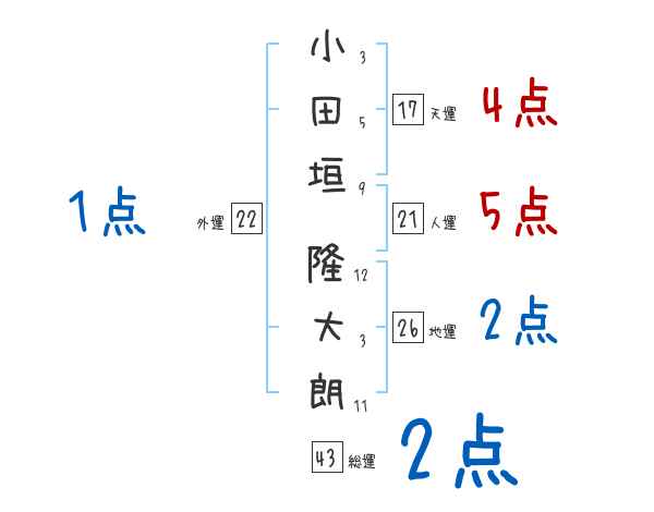 天運![]() | 小田垣隆大朗さんの天運は17画の4つ星!積極的な行動力。地位を気づき財産を手に入れる。純粋な心と直感力。 家系が持つ宿命的な運勢を表します。祖先から受け継いだ苗字ですので自分の力が及びません。家柄を象徴します。 |