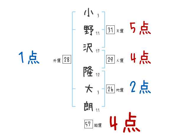 天運![]() | 小野沢隆大朗さんの天運は31画の5つ星!社交性があり判断力に優れる。順風満帆な人生で円満な生活。 家系が持つ宿命的な運勢を表します。祖先から受け継いだ苗字ですので自分の力が及びません。家柄を象徴します。 |
