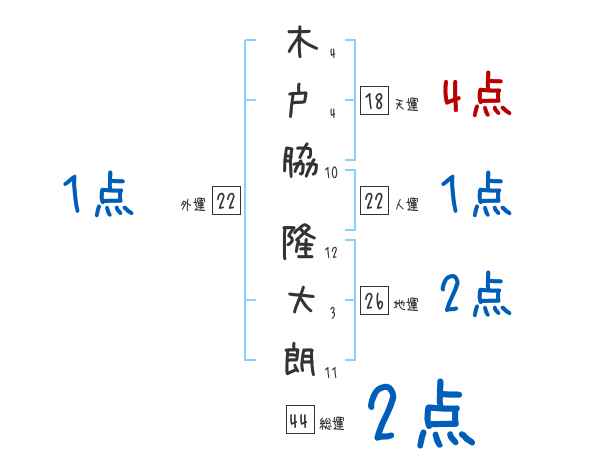 外運![]() | 木戸脇隆大朗さんの外運は22画の1つ星!努力することが苦手ないっぽう手先が器用。芸術性にも優れる。 生活面を象徴する運勢です。外部から受ける影響力を表し、結婚運、家庭運や職場、環境への順応性を表します。 |