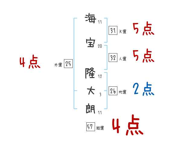 人運![]() | 海宝隆大朗さんの人運は32画の5つ星!柔軟性があり成功する。チャンスが多く金運が良い。 性格や才能などを表す2番目に重要な運勢です。人間関係や協調性、社会的な成功に影響します。主に20歳から50歳ぐらいまでの中年期の運勢を表します。 |