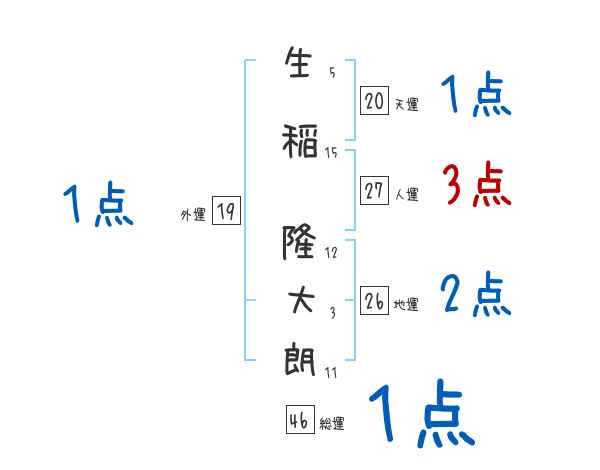 総運![]() | 生稲隆大朗さんの総運は46画の1つ星!迷走することが多く苦労するかも。目先のことにとらわれないように。 あなたの人生を表す1番重要な運勢です。生涯を通じて影響する総合運となり、主に50歳以降の晩年期に影響を及ぼします。 |
