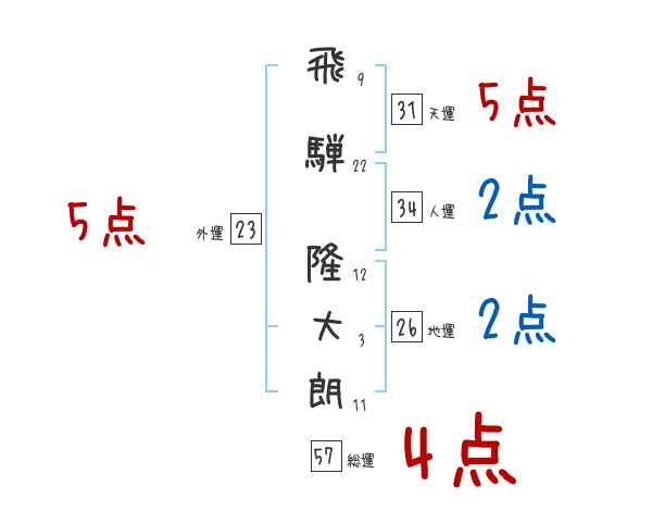 天運![]() | 飛騨隆大朗さんの天運は31画の5つ星!社交性があり判断力に優れる。順風満帆な人生で円満な生活。 家系が持つ宿命的な運勢を表します。祖先から受け継いだ苗字ですので自分の力が及びません。家柄を象徴します。 |