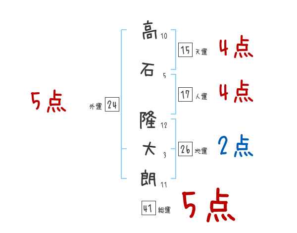 総運![]() | 高石隆大朗さんの総運は41画の5つ星!大志を抱き、目標に向かって実力を発揮し達成する。温和な性格。 あなたの人生を表す1番重要な運勢です。生涯を通じて影響する総合運となり、主に50歳以降の晩年期に影響を及ぼします。 |