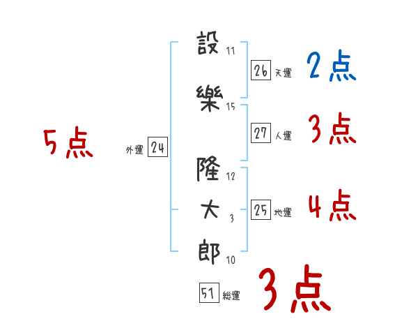 外運![]() | 設樂隆大郎さんの外運は24画の5つ星!家庭運が良く順調な人生。金運にも恵まれる。 生活面を象徴する運勢です。外部から受ける影響力を表し、結婚運、家庭運や職場、環境への順応性を表します。 |