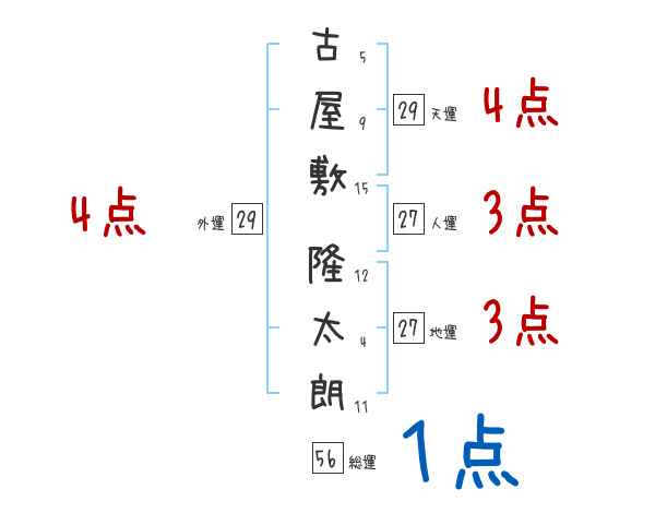天運![]() | 古屋敷隆太朗さんの天運は29画の4つ星!完全主義で才能がある。厳格な心の持ち主。 家系が持つ宿命的な運勢を表します。祖先から受け継いだ苗字ですので自分の力が及びません。家柄を象徴します。 |