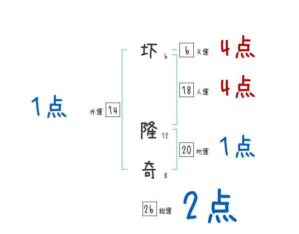 外運![]() | 圷隆奇さんの外運は14画の1つ星!人に対して優しいがストレスを溜め込みがち。人間関係のトラブルを避けるよう気をつけましょう。 生活面を象徴する運勢です。外部から受ける影響力を表し、結婚運、家庭運や職場、環境への順応性を表します。 |