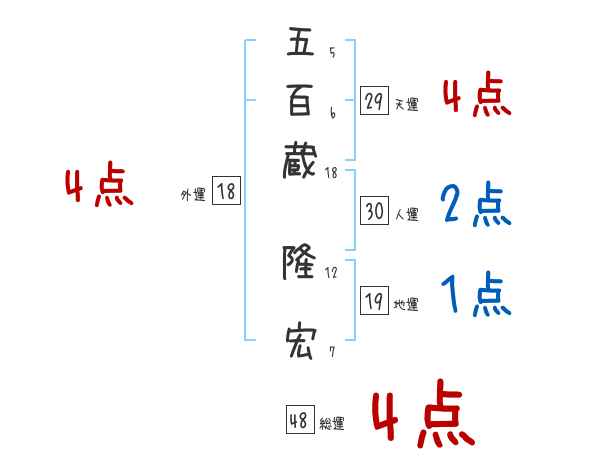 天運![]() | 五百蔵隆宏さんの天運は29画の4つ星!完全主義で才能がある。厳格な心の持ち主。 家系が持つ宿命的な運勢を表します。祖先から受け継いだ苗字ですので自分の力が及びません。家柄を象徴します。 |