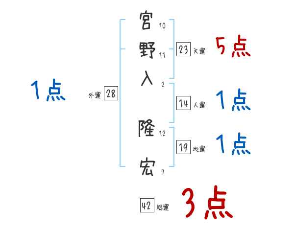 天運![]() | 宮野入隆宏さんの天運は23画の5つ星!想像力に優れ活力がある。一代で成功し名誉を手に入れる。 家系が持つ宿命的な運勢を表します。祖先から受け継いだ苗字ですので自分の力が及びません。家柄を象徴します。 |