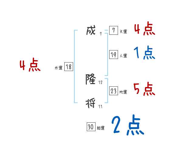 人運![]() | 成隆将さんの人運は19画の1つ星!優れた才能を持ちますが、協調性が足りないことも。周りの人と協力する事を意識しましょう。 性格や才能などを表す2番目に重要な運勢です。人間関係や協調性、社会的な成功に影響します。主に20歳から50歳ぐらいまでの中年期の運勢を表します。 |