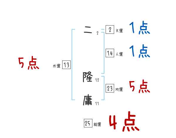 外運![]() | 二隆庸さんの外運は13画の5つ星!才能に恵まれ人気がある。名声を手に入れる。円満な人生。 生活面を象徴する運勢です。外部から受ける影響力を表し、結婚運、家庭運や職場、環境への順応性を表します。 |