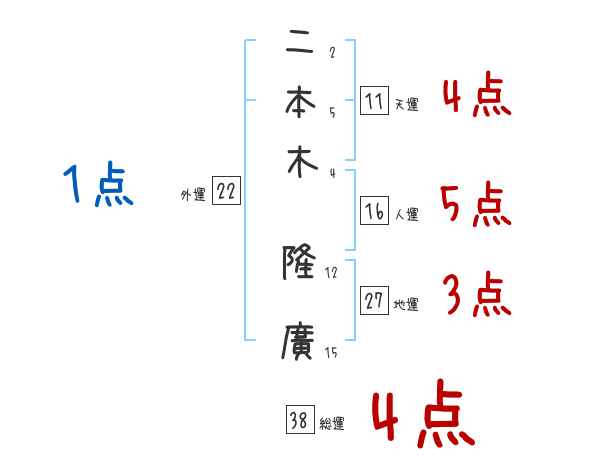 人運![]() | 二本木隆廣さんの人運は16画の5つ星!人望が厚く大きく発展する。逆転成功が見える。 性格や才能などを表す2番目に重要な運勢です。人間関係や協調性、社会的な成功に影響します。主に20歳から50歳ぐらいまでの中年期の運勢を表します。 |