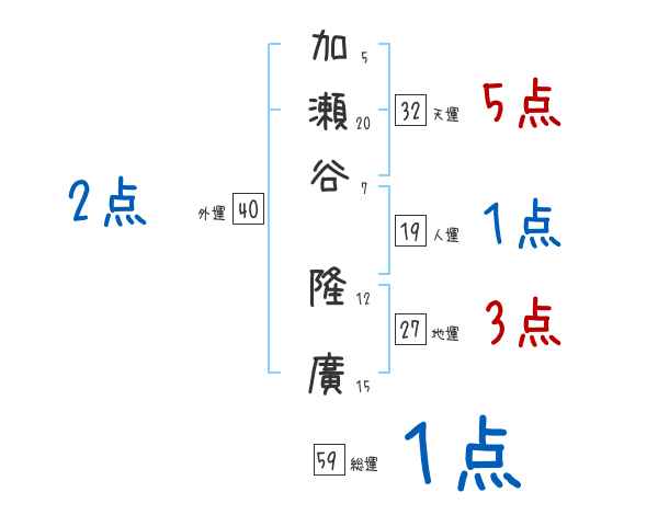 天運![]() | 加瀬谷隆廣さんの天運は32画の5つ星!柔軟性があり成功する。チャンスが多く金運が良い。 家系が持つ宿命的な運勢を表します。祖先から受け継いだ苗字ですので自分の力が及びません。家柄を象徴します。 |