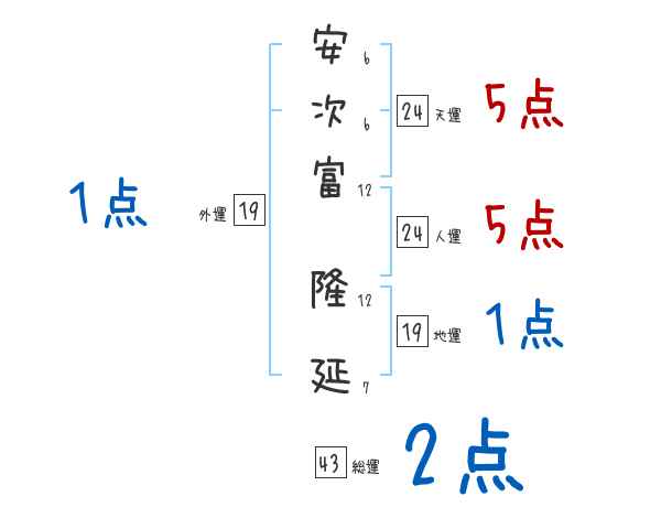 天運![]() | 安次富隆延さんの天運は24画の5つ星!家庭運が良く順調な人生。金運にも恵まれる。 家系が持つ宿命的な運勢を表します。祖先から受け継いだ苗字ですので自分の力が及びません。家柄を象徴します。 |