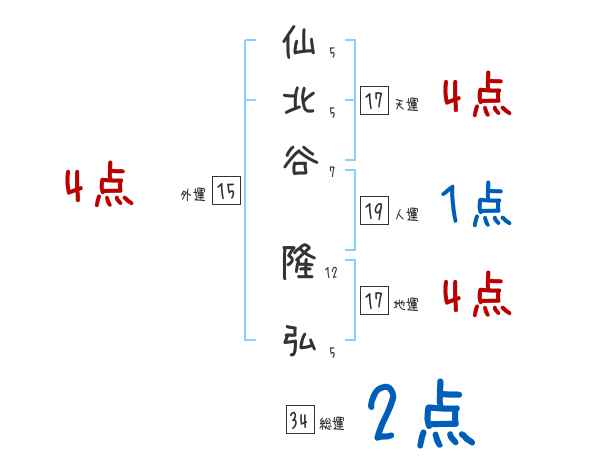 総運![]() | 仙北谷隆弘さんの総運は34画の2つ星!独創性に優れるが、自尊心が強く災難に注意しましょう。 あなたの人生を表す1番重要な運勢です。生涯を通じて影響する総合運となり、主に50歳以降の晩年期に影響を及ぼします。 |