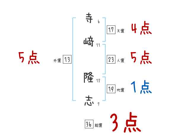 天運![]() | 寺﨑隆志さんの天運は17画の4つ星!積極的な行動力。地位を気づき財産を手に入れる。純粋な心と直感力。 家系が持つ宿命的な運勢を表します。祖先から受け継いだ苗字ですので自分の力が及びません。家柄を象徴します。 |