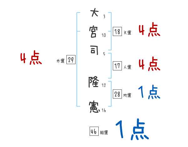 天運![]() | 大宮司隆憲さんの天運は18画の4つ星!情熱的で剛気。忍耐力があり信頼される。 家系が持つ宿命的な運勢を表します。祖先から受け継いだ苗字ですので自分の力が及びません。家柄を象徴します。 |