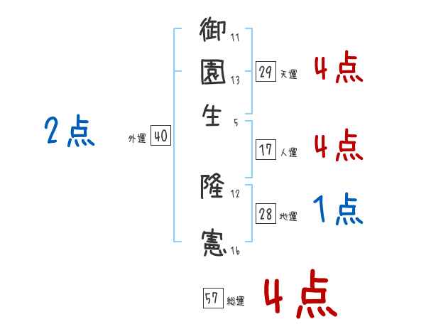 総運![]() | 御園生隆憲さんの総運は57画の4つ星!向上心があり人望がある。地位を得る。 あなたの人生を表す1番重要な運勢です。生涯を通じて影響する総合運となり、主に50歳以降の晩年期に影響を及ぼします。 |
