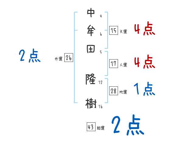 外運![]() | 中牟田隆樹さんの外運は26画の2つ星!波瀾万丈かも。信頼できる人を大事にしましょう。 生活面を象徴する運勢です。外部から受ける影響力を表し、結婚運、家庭運や職場、環境への順応性を表します。 |