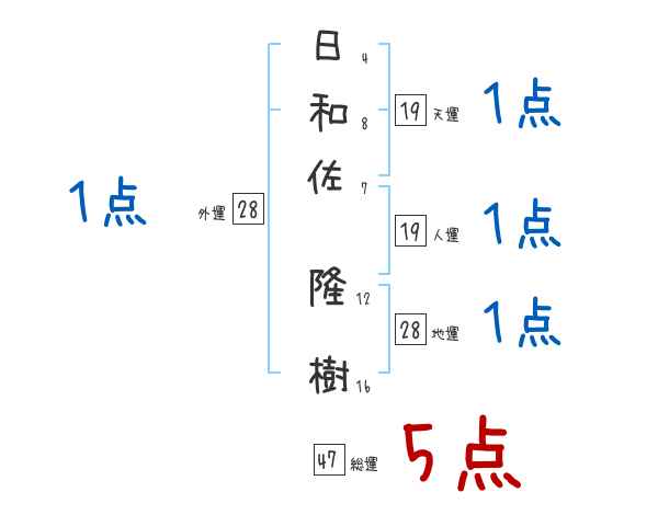 人運![]() | 日和佐隆樹さんの人運は19画の1つ星!優れた才能を持ちますが、協調性が足りないことも。周りの人と協力する事を意識しましょう。 性格や才能などを表す2番目に重要な運勢です。人間関係や協調性、社会的な成功に影響します。主に20歳から50歳ぐらいまでの中年期の運勢を表します。 |