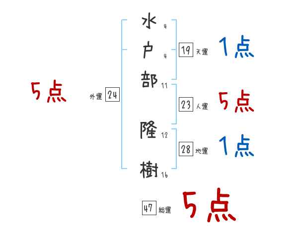 総運![]() | 水戸部隆樹さんの総運は47画の5つ星!実力が開花し発展する円満な人生。財に恵まれる。 あなたの人生を表す1番重要な運勢です。生涯を通じて影響する総合運となり、主に50歳以降の晩年期に影響を及ぼします。 |