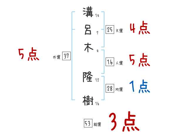 人運![]() | 溝呂木隆樹さんの人運は16画の5つ星!人望が厚く大きく発展する。逆転成功が見える。 性格や才能などを表す2番目に重要な運勢です。人間関係や協調性、社会的な成功に影響します。主に20歳から50歳ぐらいまでの中年期の運勢を表します。 |