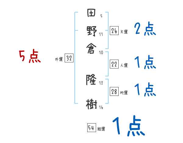 外運![]() | 田野倉隆樹さんの外運は32画の5つ星!柔軟性があり成功する。チャンスが多く金運が良い。 生活面を象徴する運勢です。外部から受ける影響力を表し、結婚運、家庭運や職場、環境への順応性を表します。 |