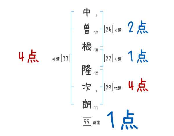 外運![]() | 中曽根隆次朗さんの外運は33画の4つ星!権力志向でプライドが高い。勇気があり運を切り開き成功する。 生活面を象徴する運勢です。外部から受ける影響力を表し、結婚運、家庭運や職場、環境への順応性を表します。 |