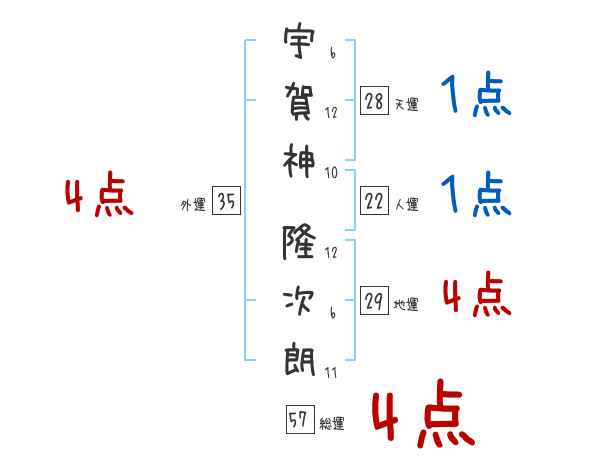 外運![]() | 宇賀神隆次朗さんの外運は35画の4つ星!温厚な性格で感受性が高い。穏和な性格で人望が厚い。 生活面を象徴する運勢です。外部から受ける影響力を表し、結婚運、家庭運や職場、環境への順応性を表します。 |