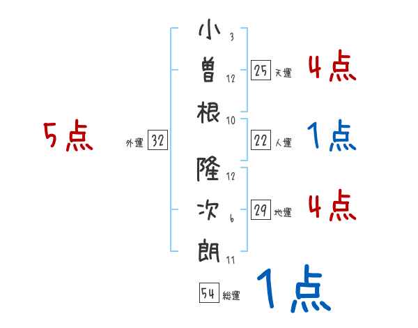 外運![]() | 小曽根隆次朗さんの外運は32画の5つ星!柔軟性があり成功する。チャンスが多く金運が良い。 生活面を象徴する運勢です。外部から受ける影響力を表し、結婚運、家庭運や職場、環境への順応性を表します。 |