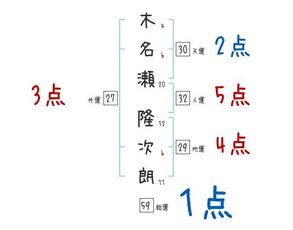 天運![]() | 木名瀬隆次朗さんの天運は30画の2つ星!浮き沈みの激しさに注意しましょう。 家系が持つ宿命的な運勢を表します。祖先から受け継いだ苗字ですので自分の力が及びません。家柄を象徴します。 |