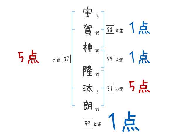 外運![]() | 宇賀神隆汰朗さんの外運は37画の5つ星!努力家で順応性に優れる。現実的な考え方ができ忠実に物事をこなす。 生活面を象徴する運勢です。外部から受ける影響力を表し、結婚運、家庭運や職場、環境への順応性を表します。 |
