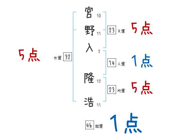 外運![]() | 宮野入隆浩さんの外運は32画の5つ星!柔軟性があり成功する。チャンスが多く金運が良い。 生活面を象徴する運勢です。外部から受ける影響力を表し、結婚運、家庭運や職場、環境への順応性を表します。 |
