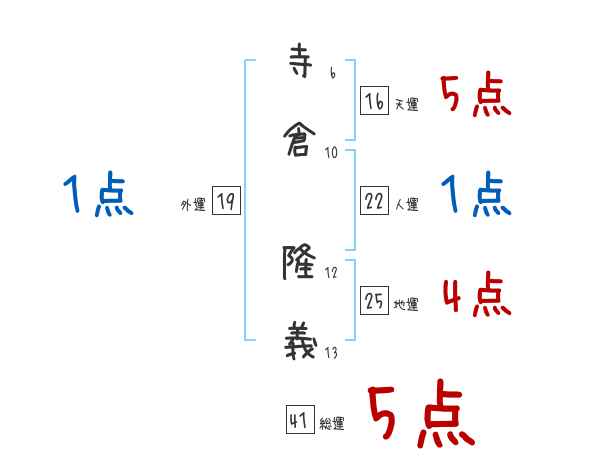 天運![]() | 寺倉隆義さんの天運は16画の5つ星!人望が厚く大きく発展する。逆転成功が見える。 家系が持つ宿命的な運勢を表します。祖先から受け継いだ苗字ですので自分の力が及びません。家柄を象徴します。 |