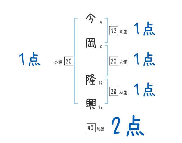 地運![]() | 今岡隆興さんの地運は28画の1つ星!家庭環境に注意。スポーツで活躍できる能力があるかも。 個性を表す基礎的な運勢です。性格形成や対人関係、行動力など家庭環境に影響されます。主に誕生してから20歳くらいまでの若年期の運勢を表します。 |