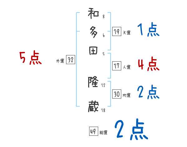 外運![]() | 和多田隆蔵さんの外運は32画の5つ星!柔軟性があり成功する。チャンスが多く金運が良い。 生活面を象徴する運勢です。外部から受ける影響力を表し、結婚運、家庭運や職場、環境への順応性を表します。 |