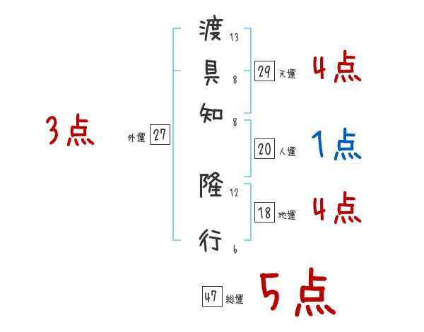 外運![]() | 渡具知隆行さんの外運は27画の3つ星!頭脳明晰だが強情で摩擦が多い傾向。孤立に注意。 生活面を象徴する運勢です。外部から受ける影響力を表し、結婚運、家庭運や職場、環境への順応性を表します。 |
