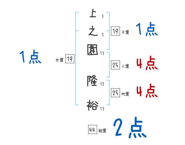 総運![]() | 上之園隆裕さんの総運は44画の2つ星!誠実で慎重な性格。物事を考えすぎないように注意しましょう。 あなたの人生を表す1番重要な運勢です。生涯を通じて影響する総合運となり、主に50歳以降の晩年期に影響を及ぼします。 |