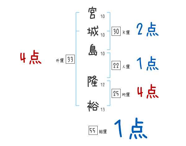 外運![]() | 宮城島隆裕さんの外運は33画の4つ星!権力志向でプライドが高い。勇気があり運を切り開き成功する。 生活面を象徴する運勢です。外部から受ける影響力を表し、結婚運、家庭運や職場、環境への順応性を表します。 |