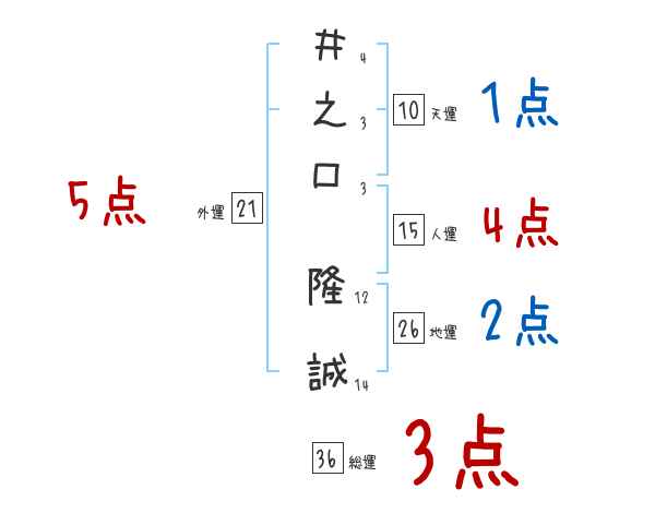 天運![]() | 井之口隆誠さんの天運は10画の1つ星!不安を感じやすい傾向。ストレスを抱えないように注意しましょう。 家系が持つ宿命的な運勢を表します。祖先から受け継いだ苗字ですので自分の力が及びません。家柄を象徴します。 |