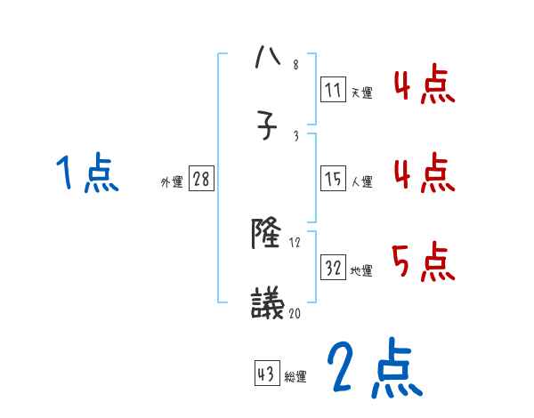 天運![]() | 八子隆議さんの天運は11画の4つ星!着実に富や地位を得る幸運な人生。 家系が持つ宿命的な運勢を表します。祖先から受け継いだ苗字ですので自分の力が及びません。家柄を象徴します。 |