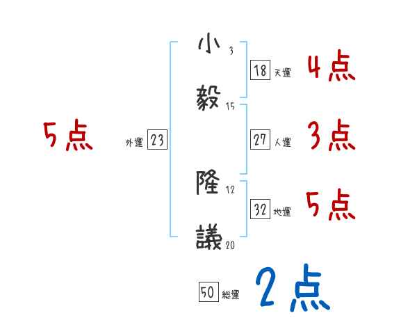 総運![]() | 小毅隆議さんの総運は50画の2つ星!浮き沈みが激しく不安定。しりすぼみに衰退しやすいので注意しましょう。 あなたの人生を表す1番重要な運勢です。生涯を通じて影響する総合運となり、主に50歳以降の晩年期に影響を及ぼします。 |