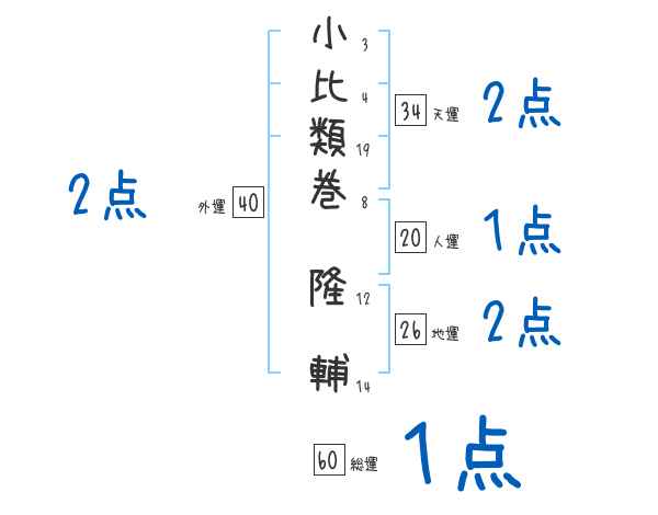 天運![]() | 小比類巻隆輔さんの天運は34画の2つ星!独創性に優れるが、自尊心が強く災難に注意しましょう。 家系が持つ宿命的な運勢を表します。祖先から受け継いだ苗字ですので自分の力が及びません。家柄を象徴します。 |