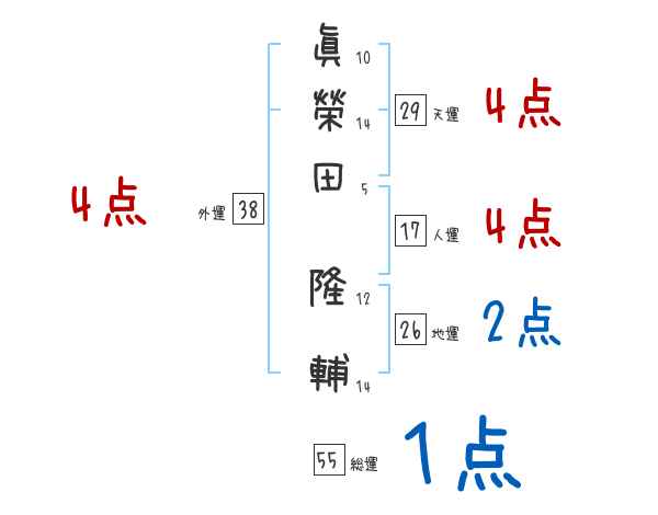 天運![]() | 眞榮田隆輔さんの天運は29画の4つ星!完全主義で才能がある。厳格な心の持ち主。 家系が持つ宿命的な運勢を表します。祖先から受け継いだ苗字ですので自分の力が及びません。家柄を象徴します。 |