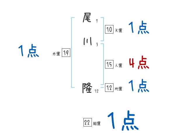 外運![]() | 尾川隆さんの外運は19画の1つ星!優れた才能を持ちますが、協調性が足りないことも。周りの人と協力する事を意識しましょう。 生活面を象徴する運勢です。外部から受ける影響力を表し、結婚運、家庭運や職場、環境への順応性を表します。 |