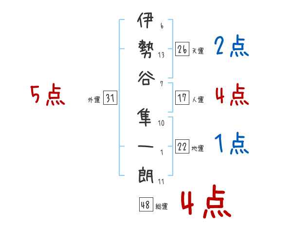 外運![]() | 伊勢谷隼一朗さんの外運は31画の5つ星!社交性があり判断力に優れる。順風満帆な人生で円満な生活。 生活面を象徴する運勢です。外部から受ける影響力を表し、結婚運、家庭運や職場、環境への順応性を表します。 |