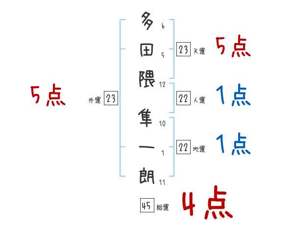 天運![]() | 多田隈隼一朗さんの天運は23画の5つ星!想像力に優れ活力がある。一代で成功し名誉を手に入れる。 家系が持つ宿命的な運勢を表します。祖先から受け継いだ苗字ですので自分の力が及びません。家柄を象徴します。 |