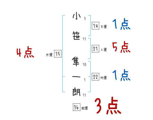 総運![]() | 小笹隼一朗さんの総運は36画の3つ星!先見性が豊かです。多少神経質で苦労することも。 あなたの人生を表す1番重要な運勢です。生涯を通じて影響する総合運となり、主に50歳以降の晩年期に影響を及ぼします。 |